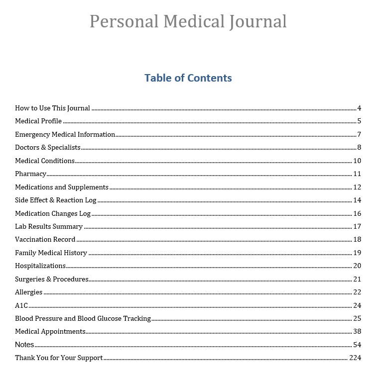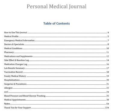 The Personal Medical History Record provides individuals and caregivers with an organized system for tracking health history, medications, lab results, vaccinations, and provider information. Designed for accuracy and accessibility, this record book helps patients communicate clearly with healthcare professionals and maintain a comprehensive overview of their medical journey.